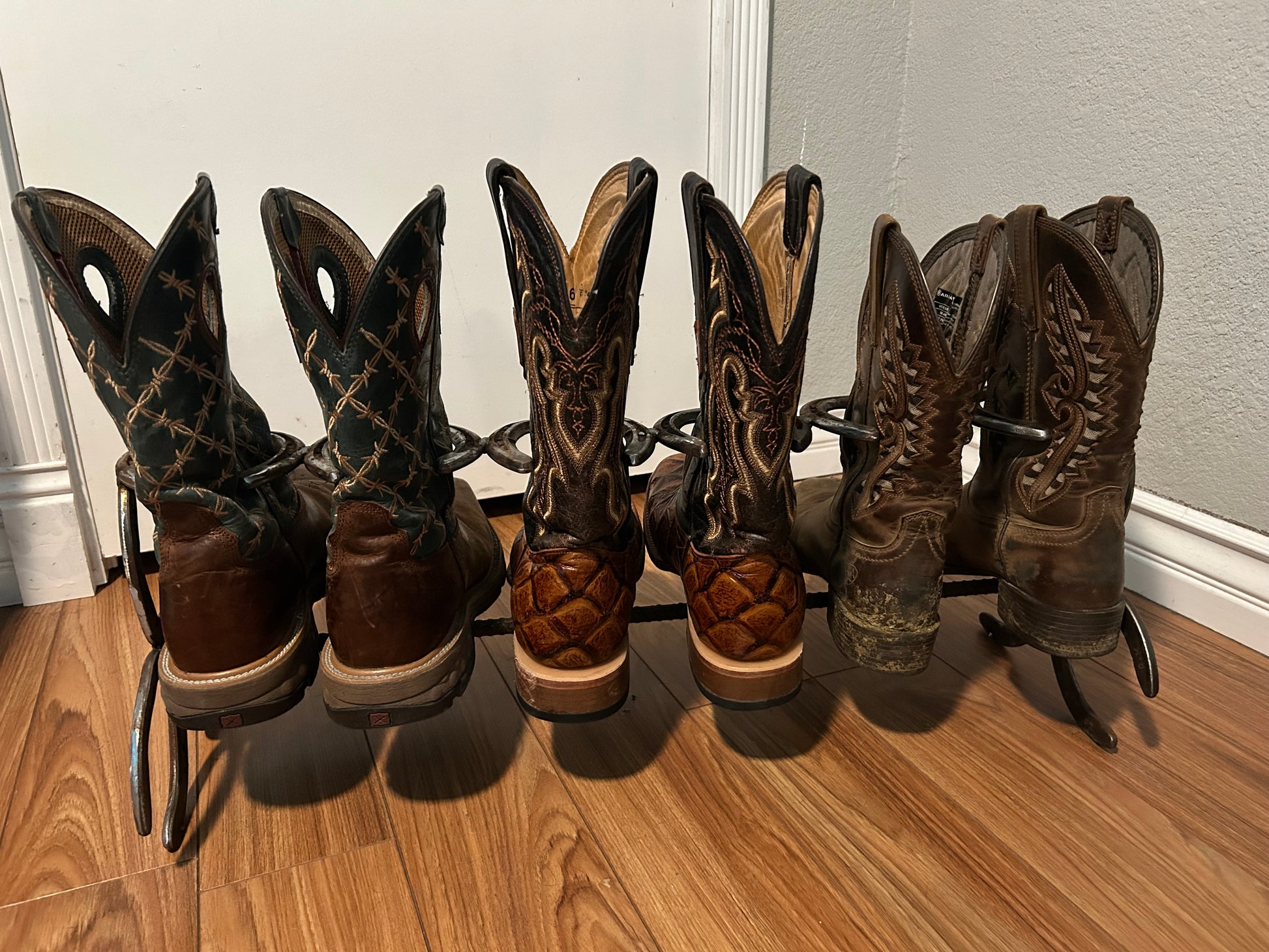 Home made horseshoe boot holder, personally welded by me and the horseshoes are from my farrier!