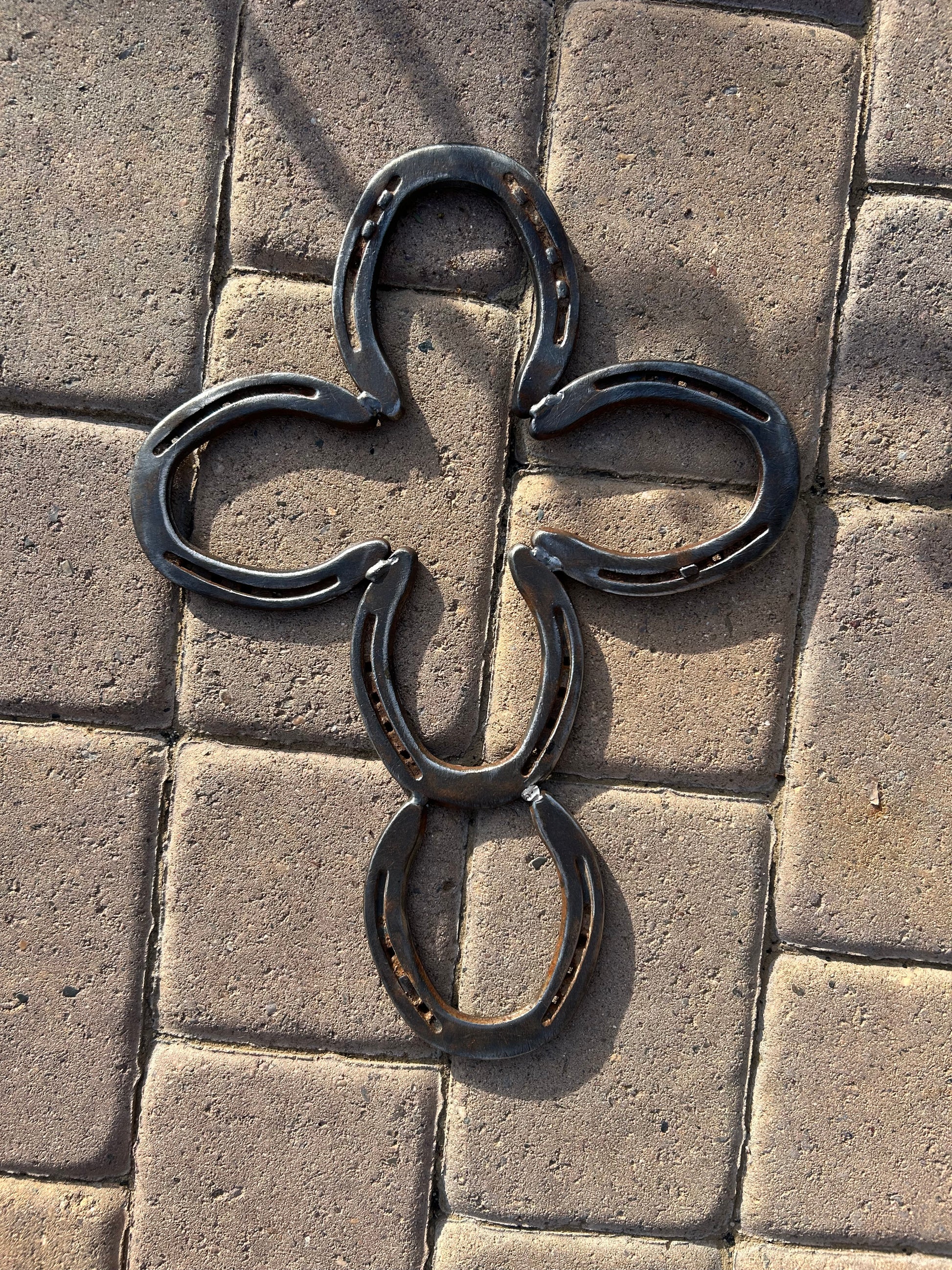 Hand welded horseshoe cross with horseshoes from my local farrier!